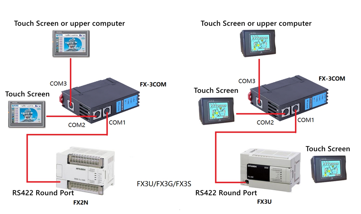 - ETH-FX is an economical version of BCNet-FX, which can expand the RS422 programming round port for Mitsubishi FX3U/FX3G/FX3S series PLC to two RS422 programming round ports and one Ethernet interface. The expanded round port can be connected to a touch screen, and the expanded Ethernet interface supports the MC protocol (BCNet-FX supports both MC protocol and ModbusTCP protocol), supporting Ethernet programming, program download, and upper software monitoring.