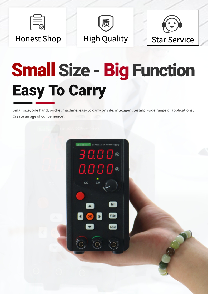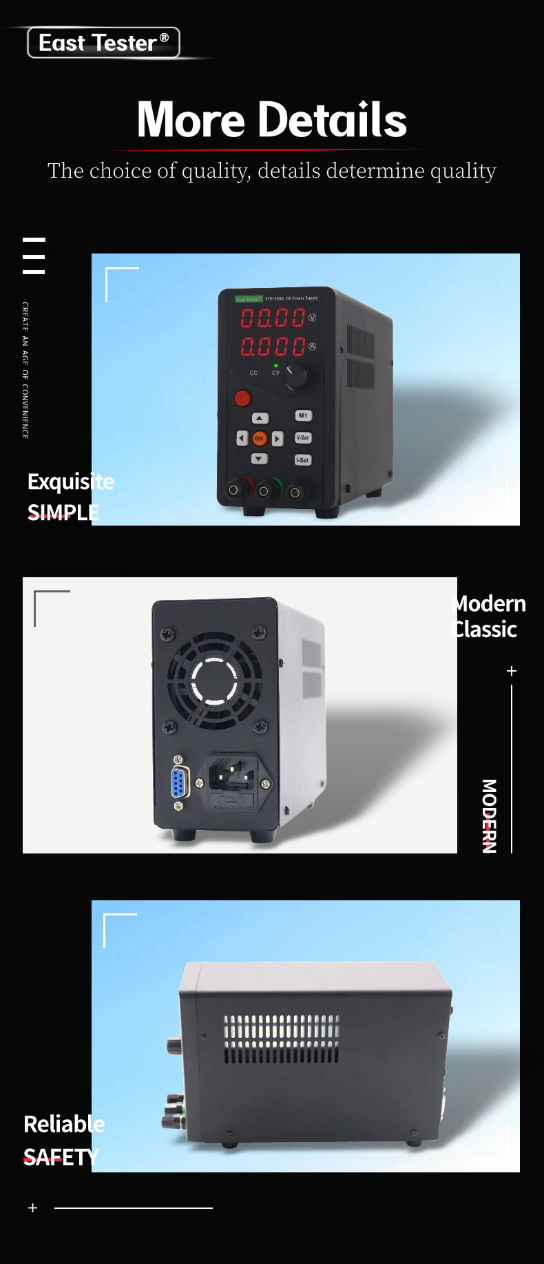 - This series of adjustable DC regulated power supply is a single output DC regulated power supply, four LED digital display, can display voltage and current at the same time; Voltage (CV) and current (CC) modes are automatically switched, and voltage and current are continuously adjustable. Using advanced switching power control technology and components, high efficiency, light weight, energy saving and environmental protection.