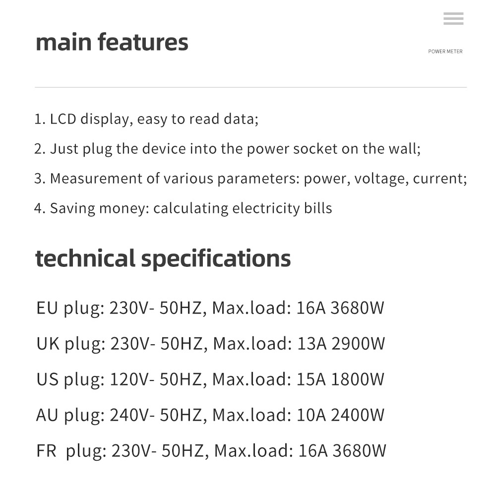 - You can determine the current, voltage, power consumption, and the cost of the appliances connected to it.