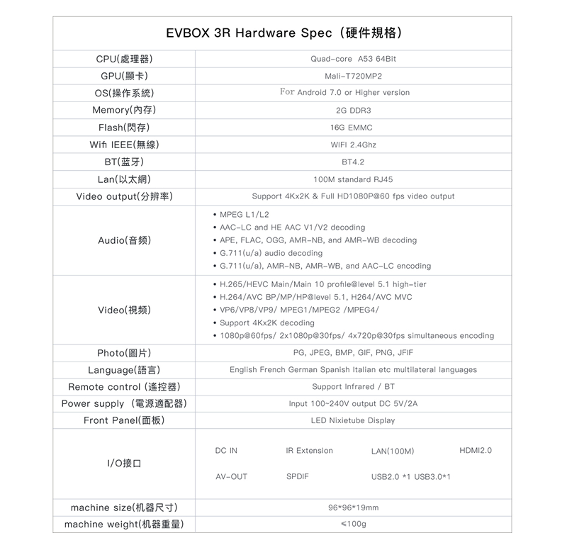 EVBOX 3R supports for Dolby and DTS surround sound that can bring you film-like home theater experience. With a digital screen, it can display time, playing status, connection statues of USB cable, Ethernet cable and WiFi. Two hanging holes on the back makes installation easier, saving more space for you.