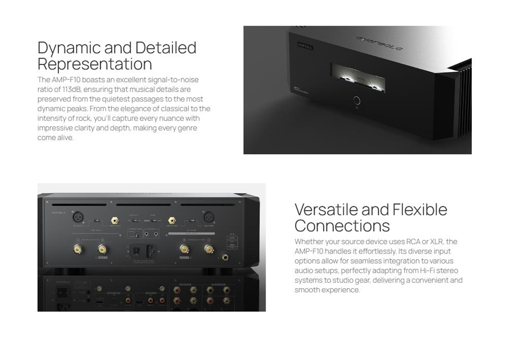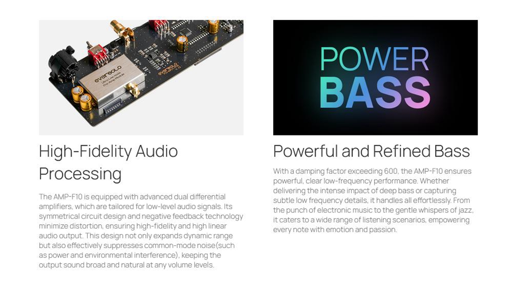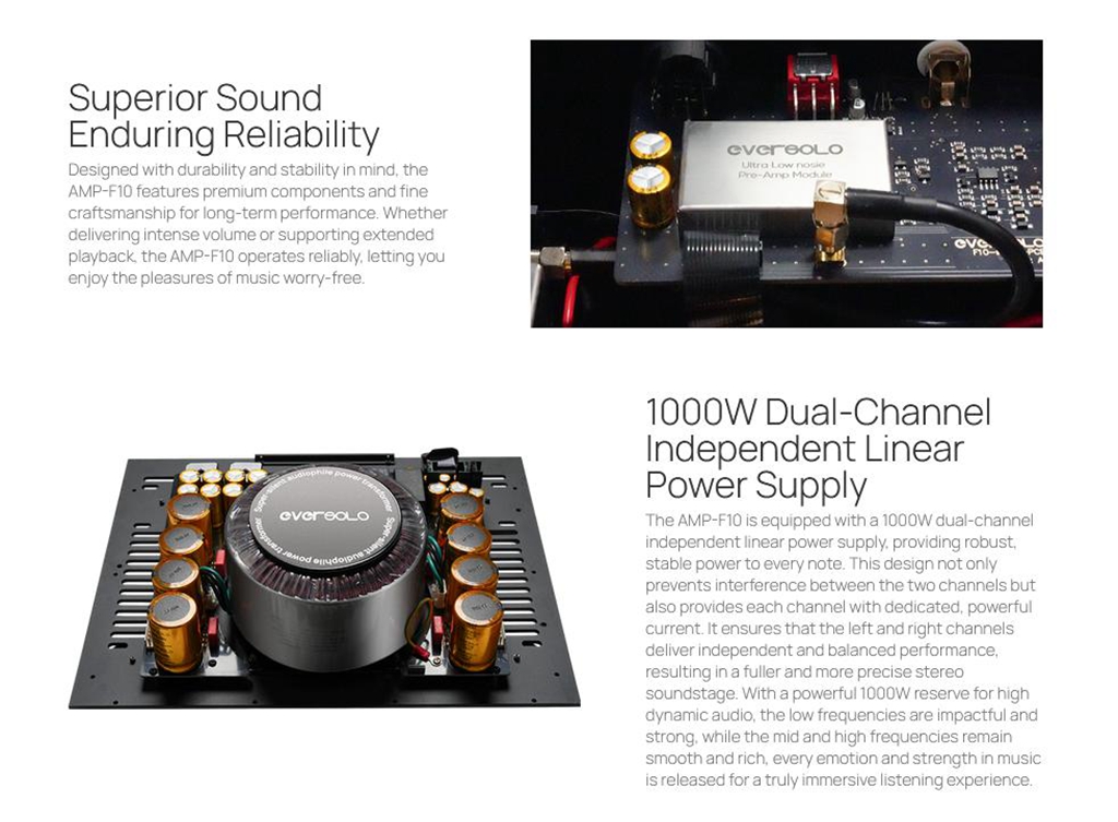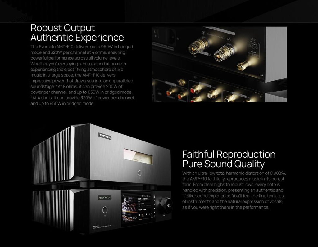 - The Eversolo AMP-F10 is not just an amplifier but the dream choice for your audio systems. Whether you’re an audiophile or a home theater lover, the AMP-F10 delivers an unrivaled auditory experience.
