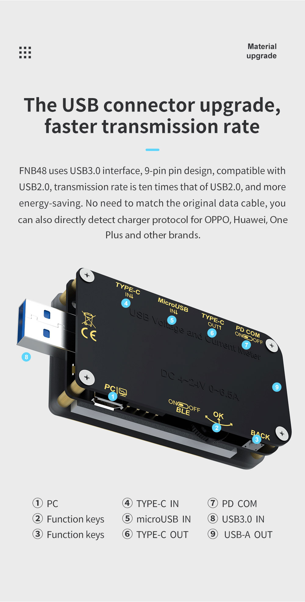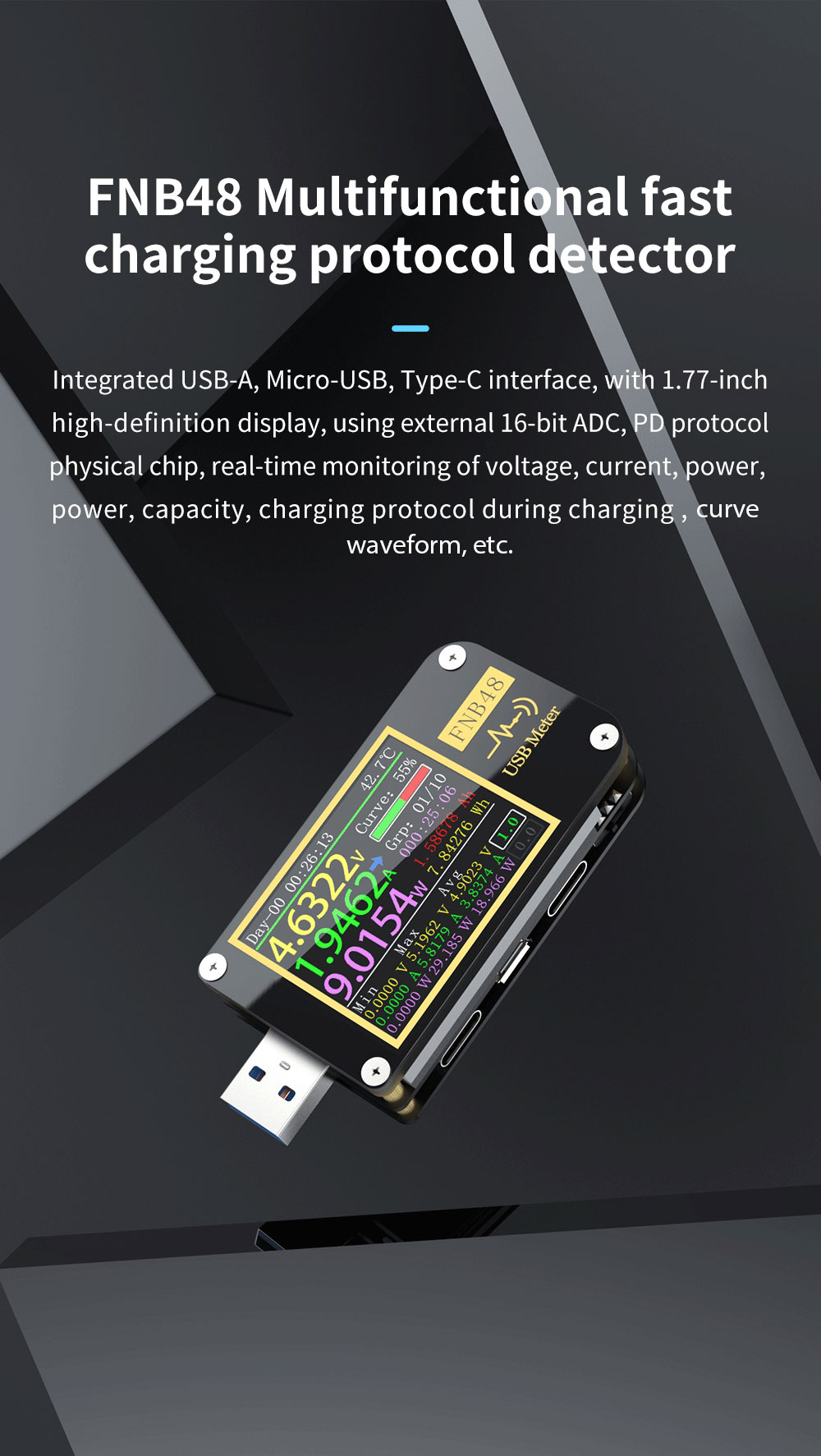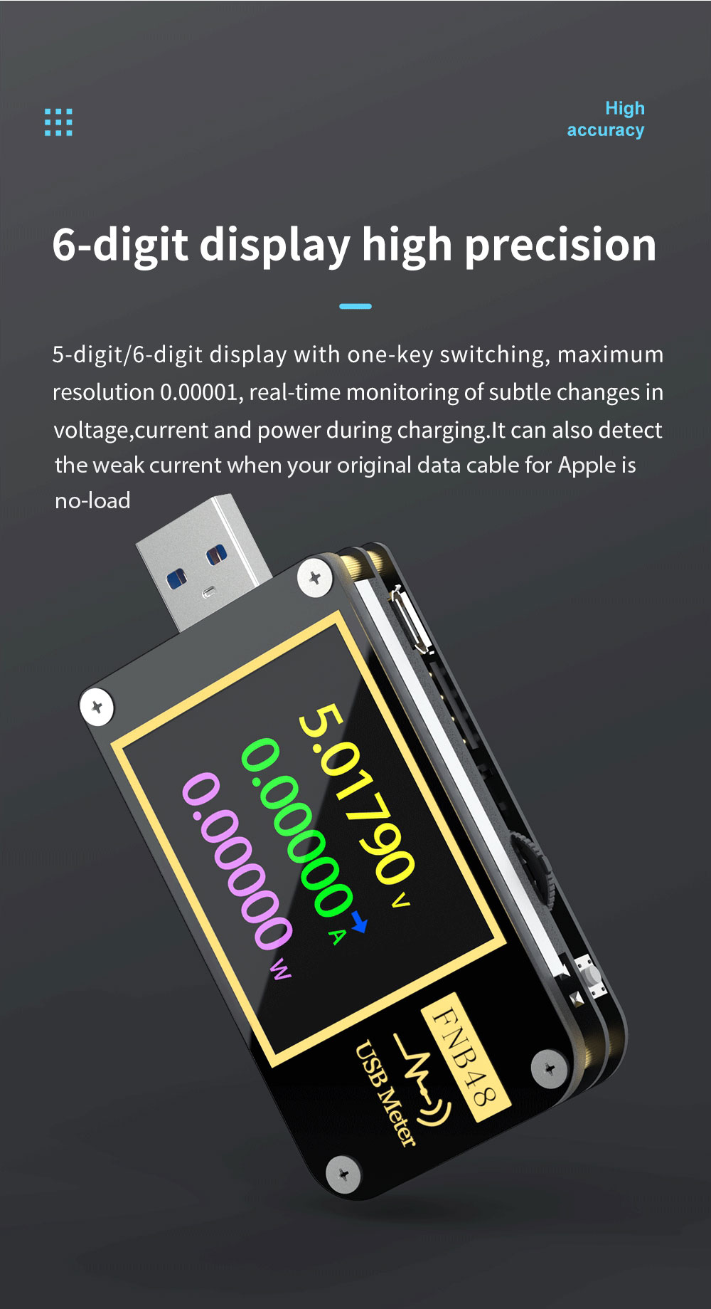FNB48 With Bluetooth USB Meter Voltage Meter USB Current Tester 6-Digit Display For QC PD Protocols