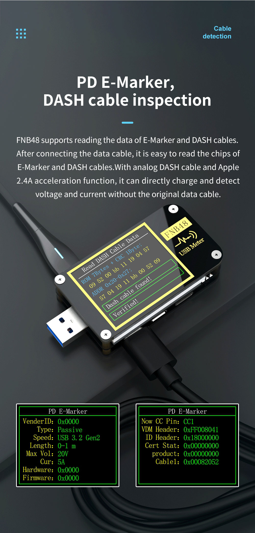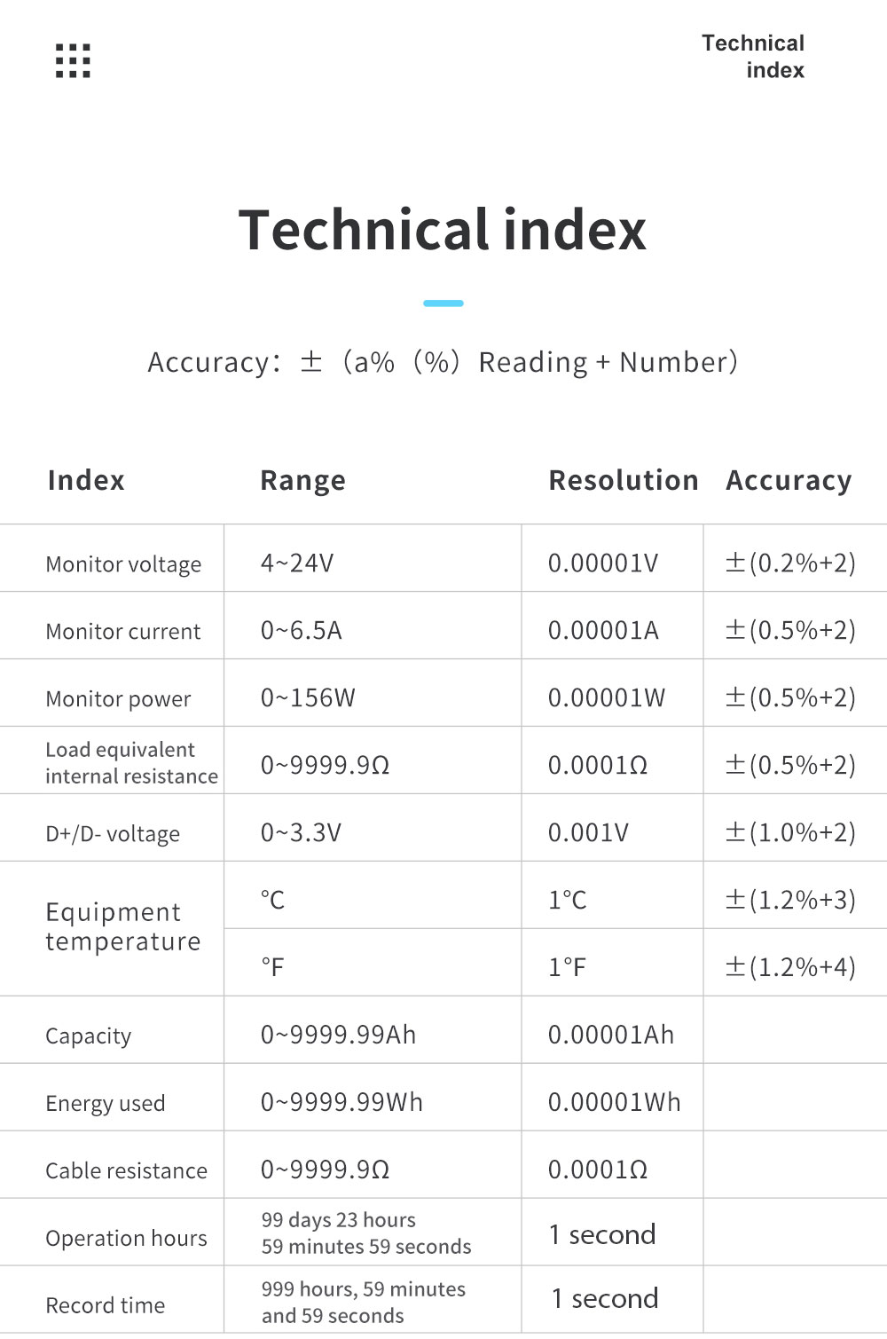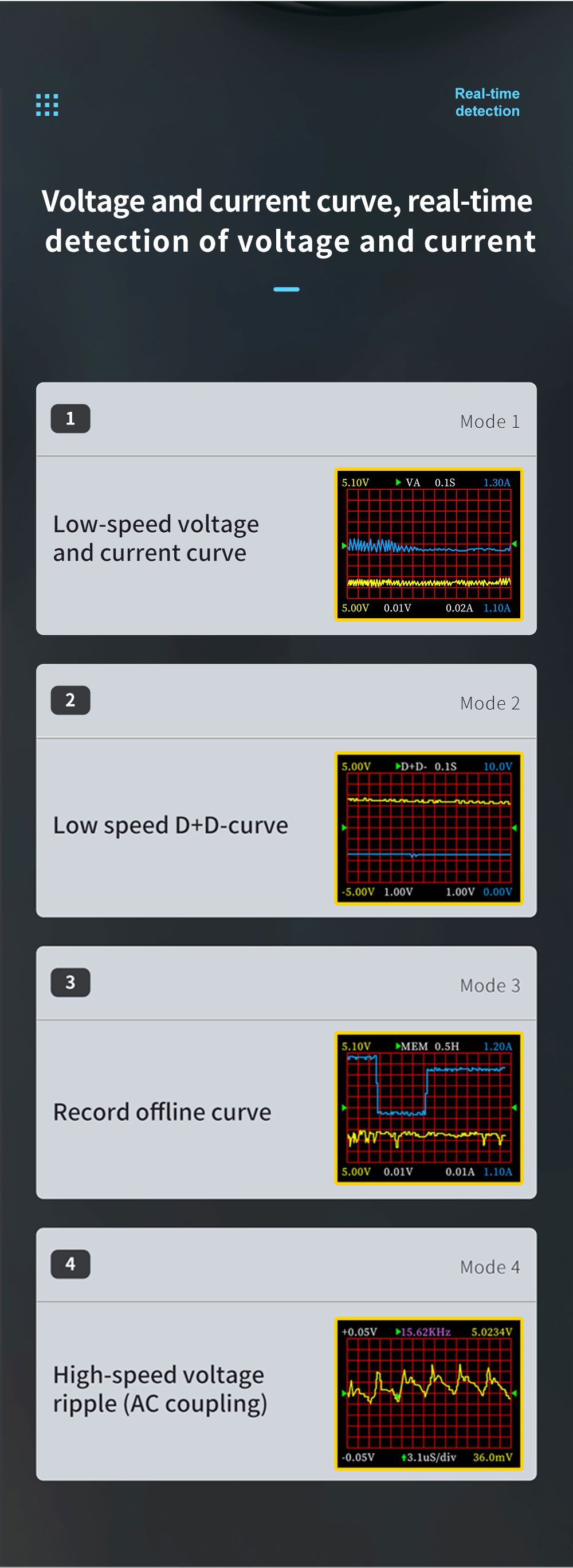 - Protocol Detection: for APPLE 2.4A, QC2.0, QC3.0, PD, Samsung AFC, Huawei FCP, Huawei SCP, OPPO VOOC, DASH, WAEP, SuperVOOC, MTK-PE