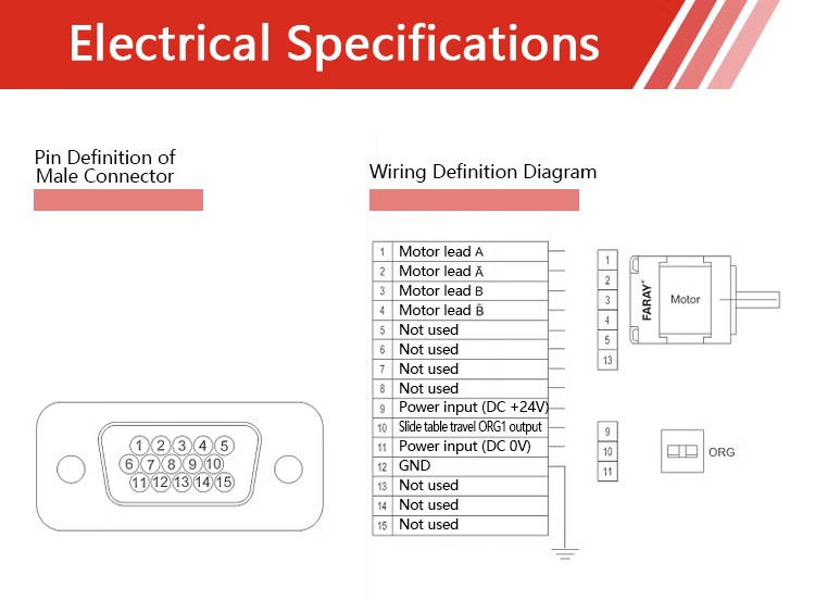 - It is designed with a 35cm/13.8" cable and a D-SUB 15-pin male connector, a stepper motor, and a photoelectric switch.