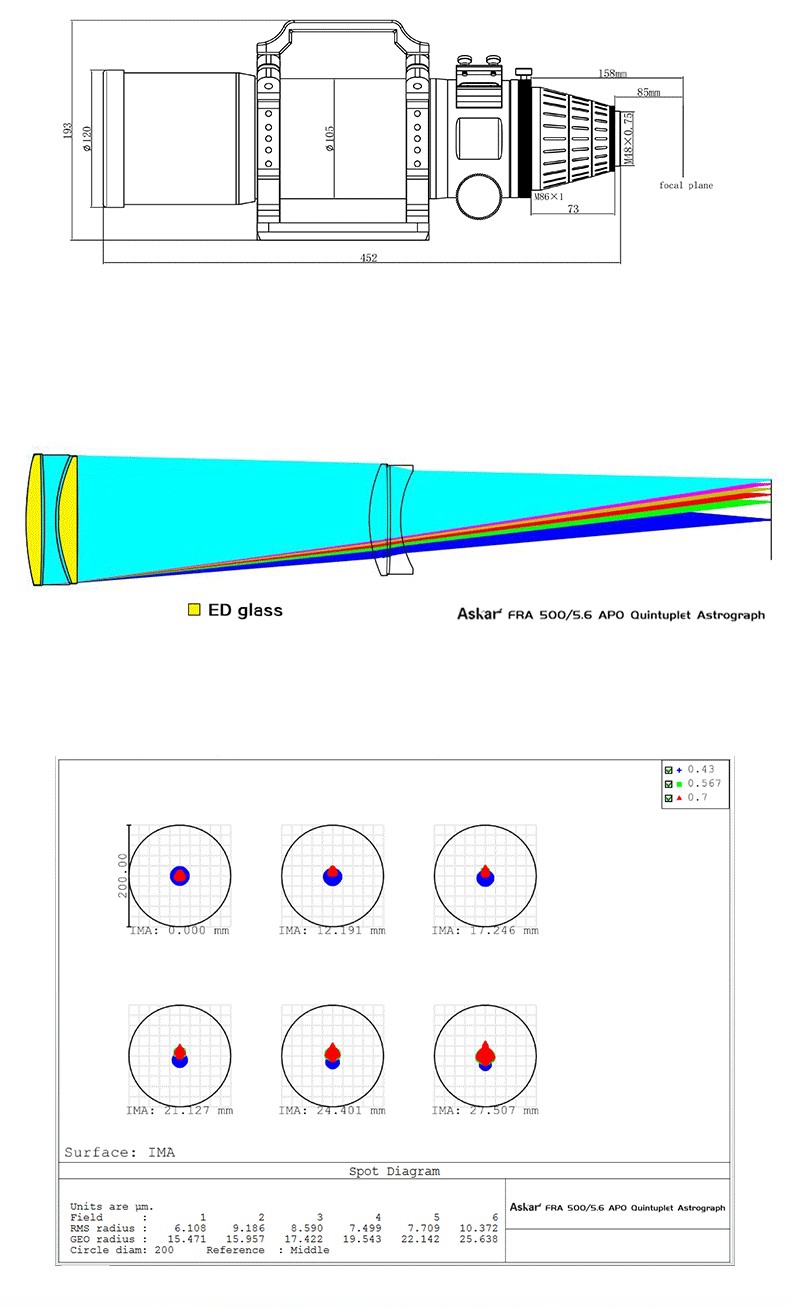 - In terms of optical design, the Askar FRA500 adheres to the high-quality design concept of the FRA series and adopts a five piece fully separated APO Pittsburgh lens design from the front three to the back two. The front three piece fully separated lens group contains two ED glasses, which can effectively correct color difference and improve imaging sharpness. The rear two piece fully separated lens group can increase the flatness of the image field. Therefore, even at the very edge of the field, the star can reach a very excellent level. The imaging circle of Askar FRA500 is 55mm, which is higher than the 44mm imaging circle. Allowing enthusiasts to no longer worry about the quality of surrounding stars. The back intercept is also the design of "focusing is the best", and astronomy enthusiasts no longer need to repeatedly calculate the back intercept distance or struggle to find a suitable connecting ring.