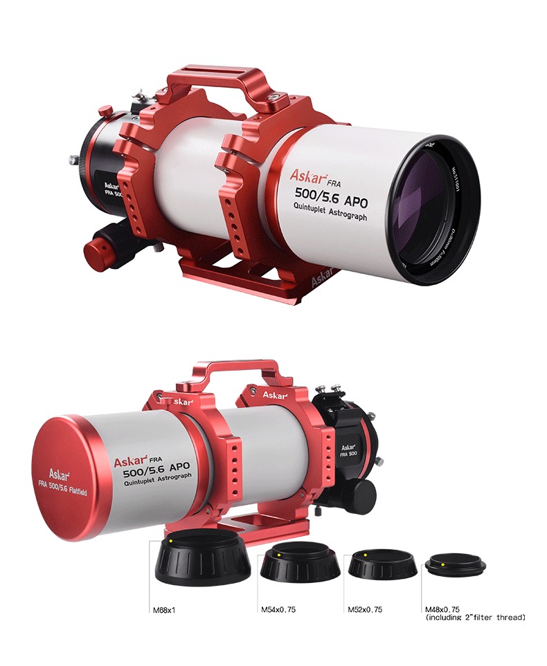 - The Askar FRA500 still pursues a combination of practicality and artistry in mechanical design. The overall line of the equipment is smooth and the layout is reasonable. The front end of the star camera is a dew protection cover with a classic red decorative ring. When the protective cover is fully extended, the overall length of the camera lens is 452mm; After retracting the protective cover, the overall length of the camera is 410mm. The back-end is a high-quality 3.5” Toothed focusing device. The focusing device is equipped with a coarse adjustment handwheel and a 1:10 fine adjustment handwheel, which can easily realize two speed focus adjustment, and has high practical value in actual astronomical photography and observation. The surface of the focusing device is polished well, the paint layer is uniform, and the internal scale is accurate and clear. The focusing device is solid and stable, and the left side is equipped with a standard finder-scope base and a hand screw. Therefore, the Askar FRA500 focusing device can effectively carry finder-scope, guide telescope and other celestial objects astronomical accessories and meet the needs of accessory combinations for astronomical photography or observation. The Askar FRA500 still includes a pair of highly acclaimed multifunctional hoops. The upper end of the clamp is connected to the handle, and the bottom is connected to the Askar wide dovetail plate. The white main lens barrel and protective cover, the bright black focusing device, and the red hoop and decorative ring make the color combination of the entire shooting lens lively and steady.