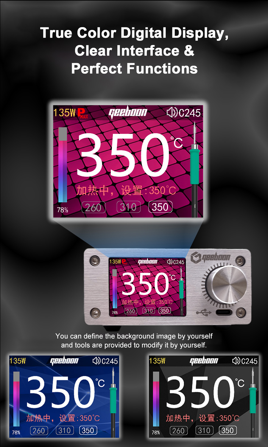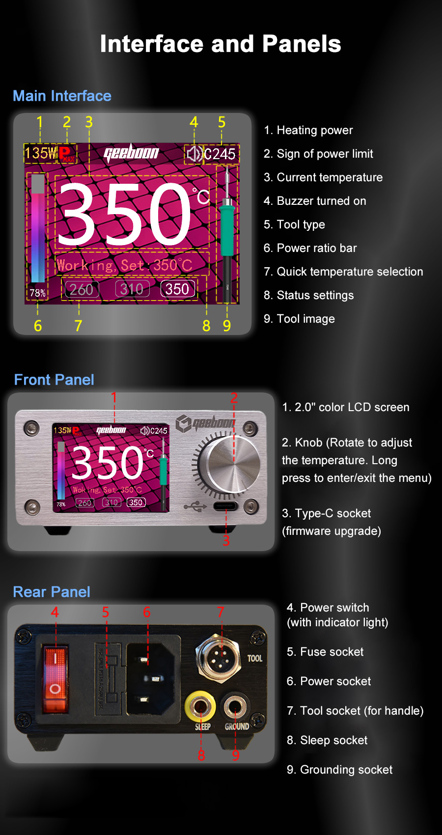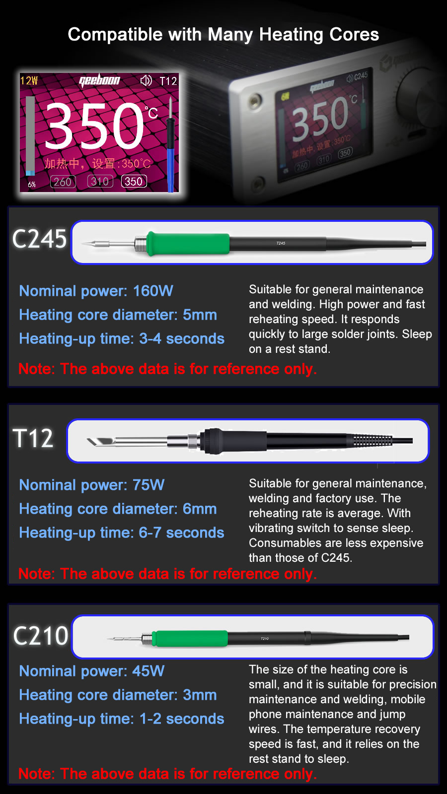 * C245, C210 and T12 heating elements can be used. Thus, the soldering station can be used in many scenarios.