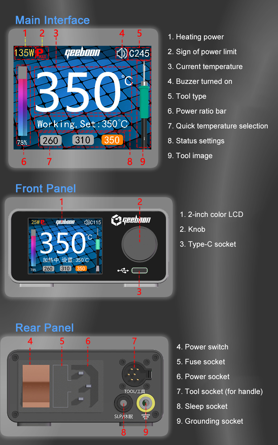 * Maximum heating power: 240W (The software will control the heating power to be less than this power. And when C245 is used, it will unlock the power to 240W)