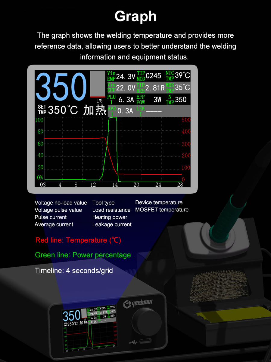 * Graph: The graph shows the welding temperature and provides more reference data, allowing users to better understand the welding information and equipment status. The curves make it easy to observe