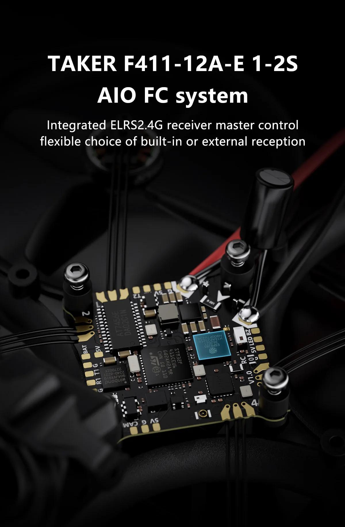 - TAKER F411-12A-E 1-2S AIO flight system integrates ELRS 2.4G receiver, which takes up less space and is more cost-effective.