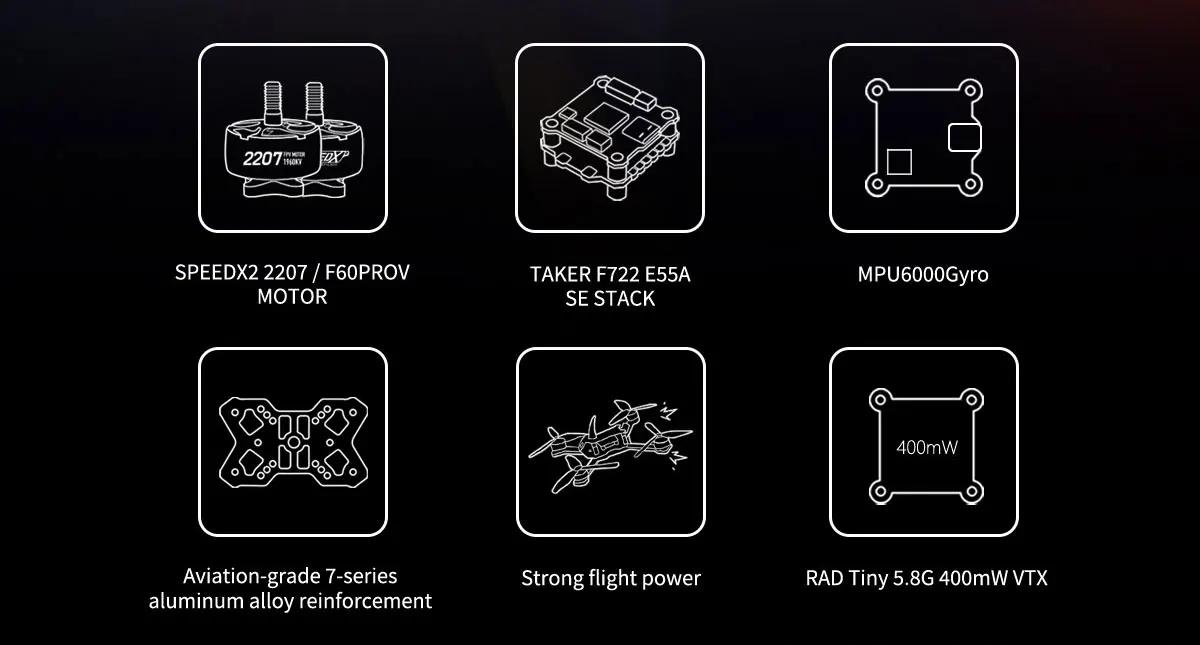 - The main structure of Racer is constructed with 7075-T6 aviation aluminum alloy splint combined with high-grade T700 carbon plate, the overall structure is light and stable. The flight system uses GEPRC's new TAKER F722 E55A stack with two motor versions: GEPRC SPEEDX2 2207 2050KV and TMOTOR F60PROV 2020KV professional racing motor. The overall performance has strong explosive power.