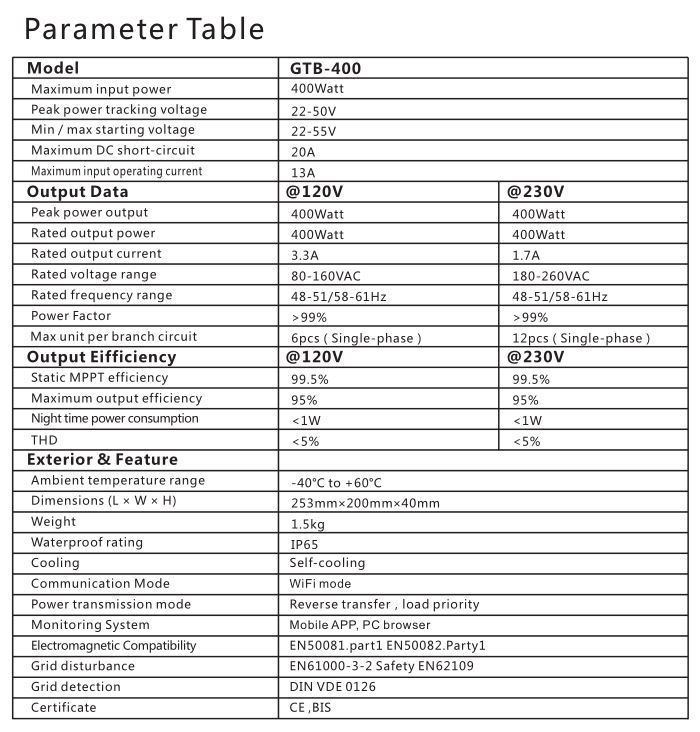 Grid Tie Inverter Solar Grid Tie Micro Inverter Output Power 400W For Solar Panel GTB-400