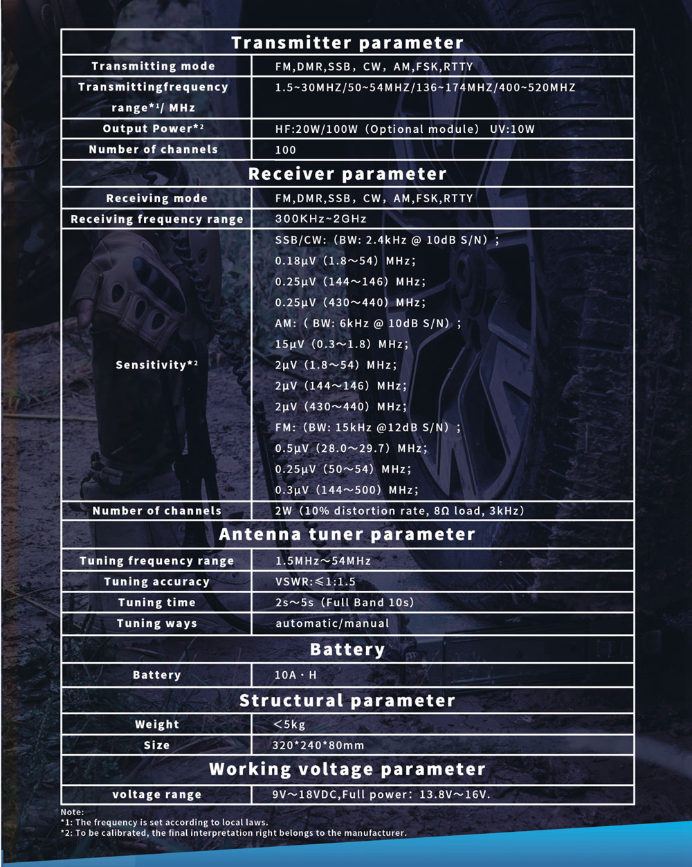 PMR-119 is a multi-purpose vehicle/backpack tactical radio station with all the functions of traditional ones. It supports SSB, CW, AM, FM, DMR. The radio station is equipped with fully automatic antenna tuner and can use various tactical and static antennas. The protection capability reaches IP67 and military aviation plug is adopted. The system includes a backpack station, a vehicle-mounted dock and a base station dock. When working in a vehicle-mounted or base station mode, the output RF power is short-wave 20W or 100W (100W power amplifier is optional) PEP and UV 20W. It can also be used as a relay.