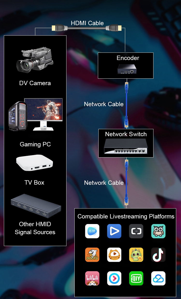 - Can be used for live broadcasting, monitoring NVR recording and broadcasting, IPTV live broadcasting and LAN live broadcasting. Support low-latency transmission and OSD settings