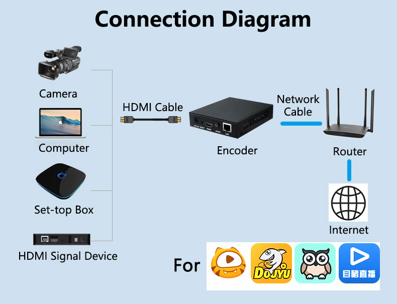 - HD encoder supports 1080P60 HDMI video signal input loop out
