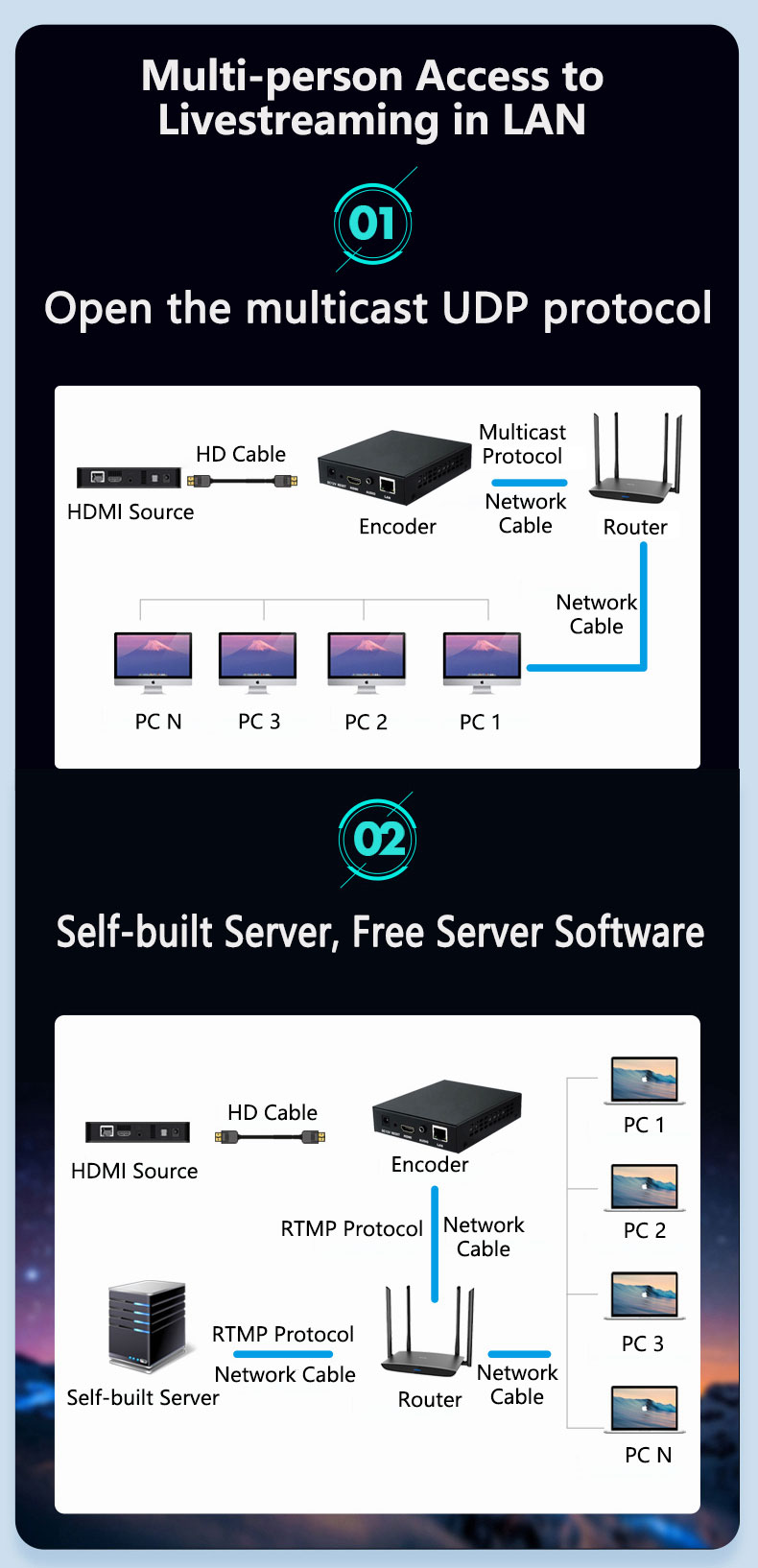 - The method for multiple people on the LAN to access the live broadcast: Open the multicast UDP protocol. Self-built server, free to provide server software