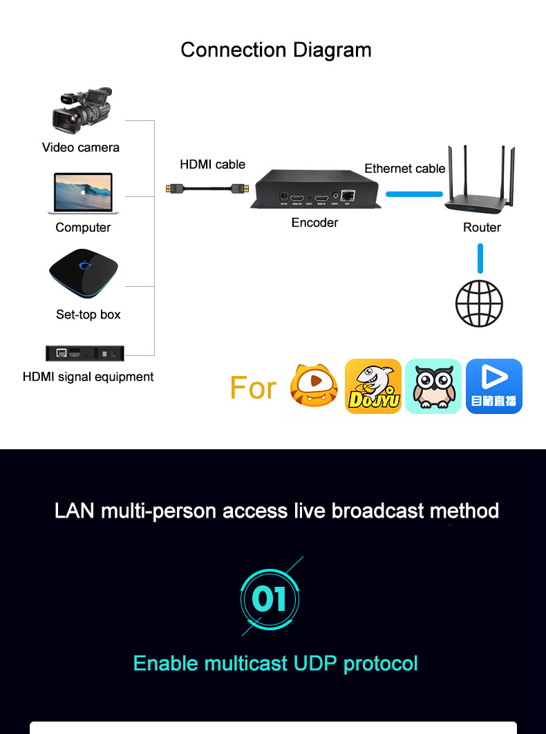Support for INKE LIVE, Changba live, kg.qq.com, YY live, huajiao.com, live.kuaishou.com, panda.tv, Douyu, Huya.com, QQ live. Built-in server for RTMP/SRT: Default streaming address: rtmp://192.168.1.168/live/0