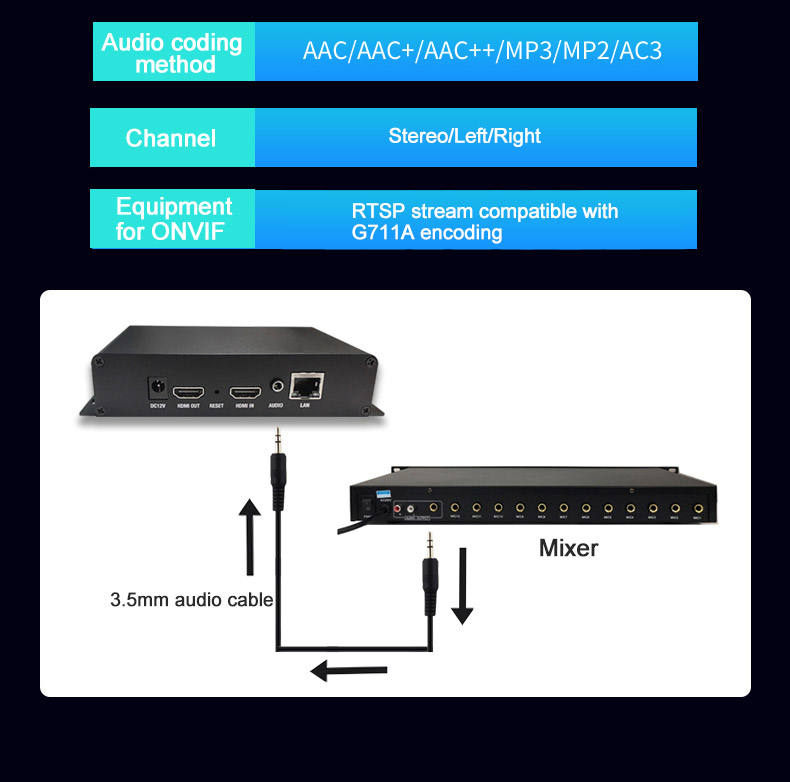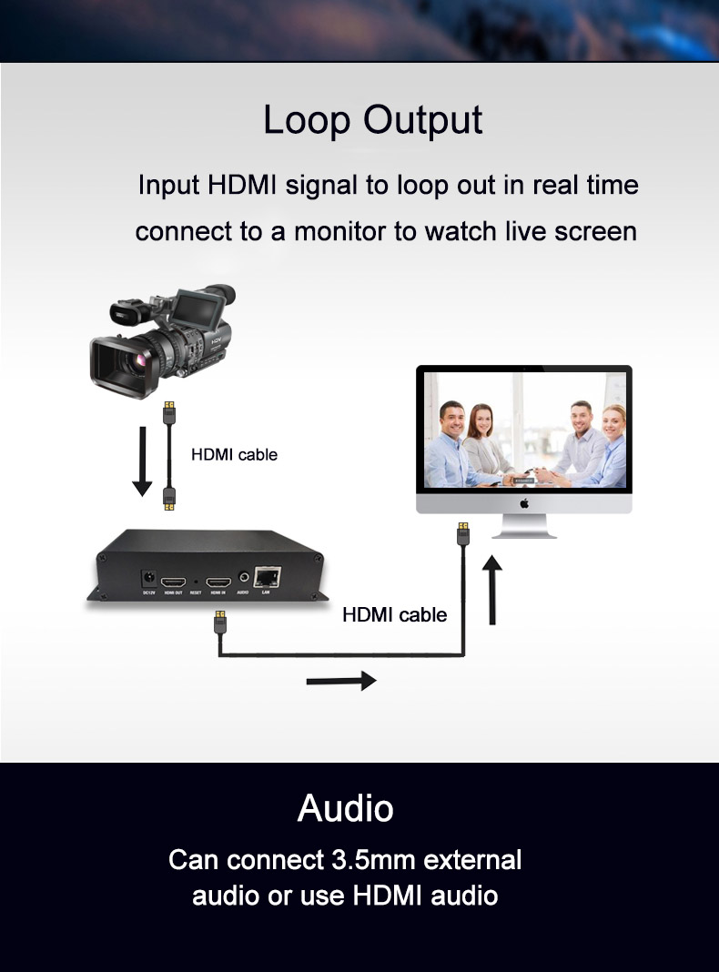 - Audio input: 1 HDMI internal audio, 1 HDMI external audio
