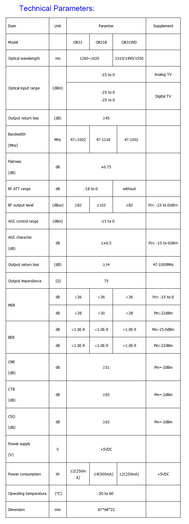 It is a low-heat, high-reliability, high-index optical receiver developed to adapt to the diversification of FTTH. It is suitable for indoor optical receivers, buildings, building optical receivers, and indoor optical receivers for cable TV optical fiber transmission. It has a light-controlled AGC function, which can keep the OR31/WD output in the range of -15 to 0dbm in the optical input power to keep 80dBm constant, and the FTTB-031 output is not less than 102dbm.