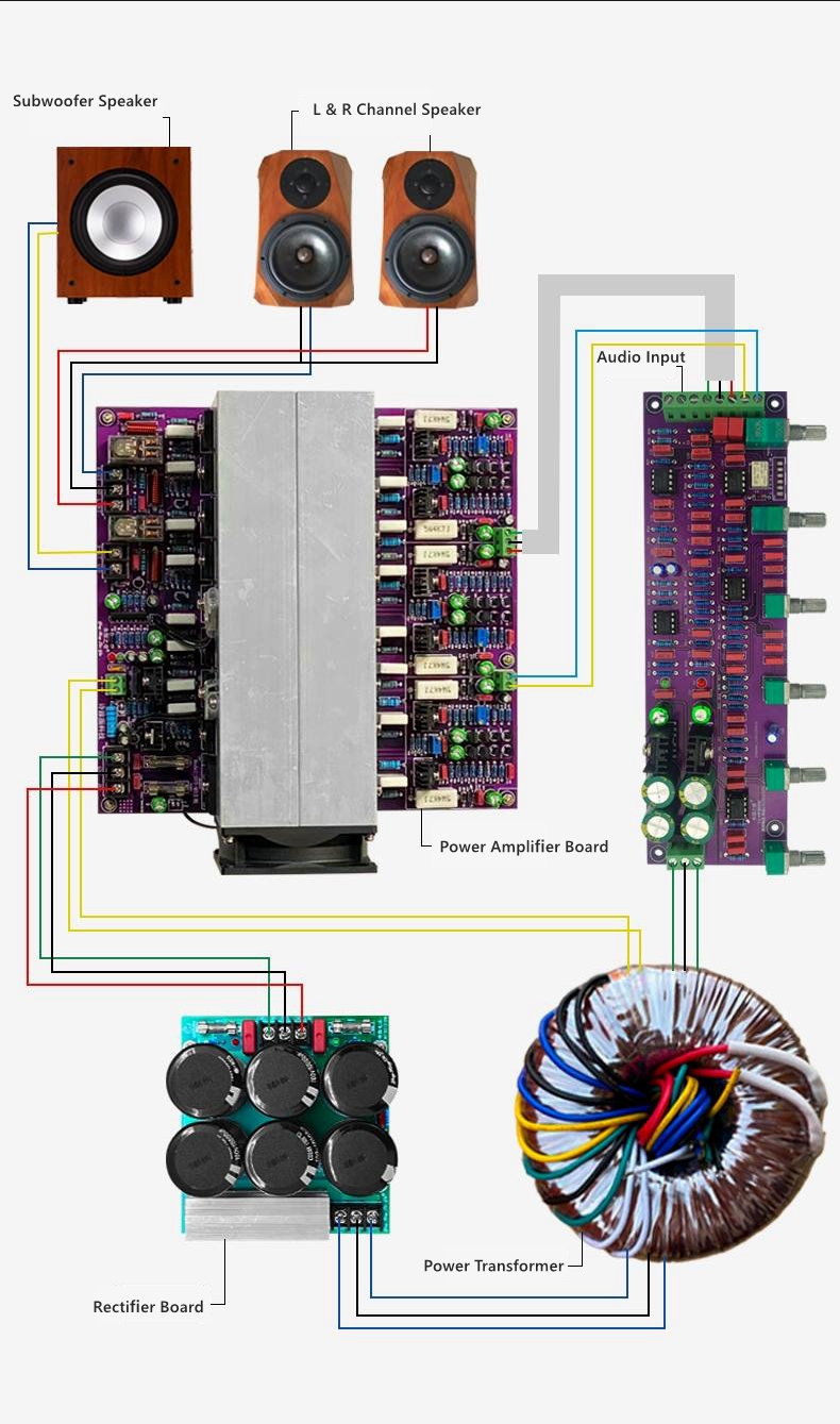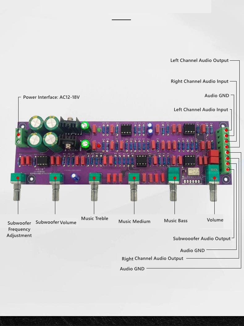 - The 2.1 preamplifier board left and right stereo + a subwoofer (subwoofer speaker) is equivalent to a 3-channel independent amplifiers, with 2 channels on the left and right, and one subwoofer channel. The subwoofer's function is to compensate for the subwoofer part of stereo sound, usually at frequencies below 100Hz. This model 2.1 preamplifier board needs to be paired with a 3-channle rear stage amplifier board. It is recommended to use one board with a 3-channel amplifier circuit, or use a 2-channel rear stage amplifier board with a mono rear stage amplifier board. The speaker needs a stereo speaker and a subwoofer, which is what we call the 2.1 audio matching system.