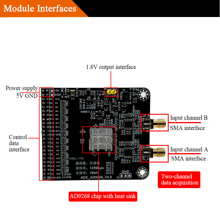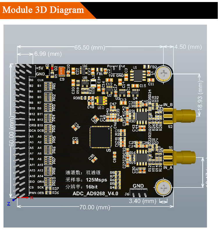 High Speed AD9268 16bit 125MSPS ADC Module 2-Channel Analog to Digital Converter for Communication