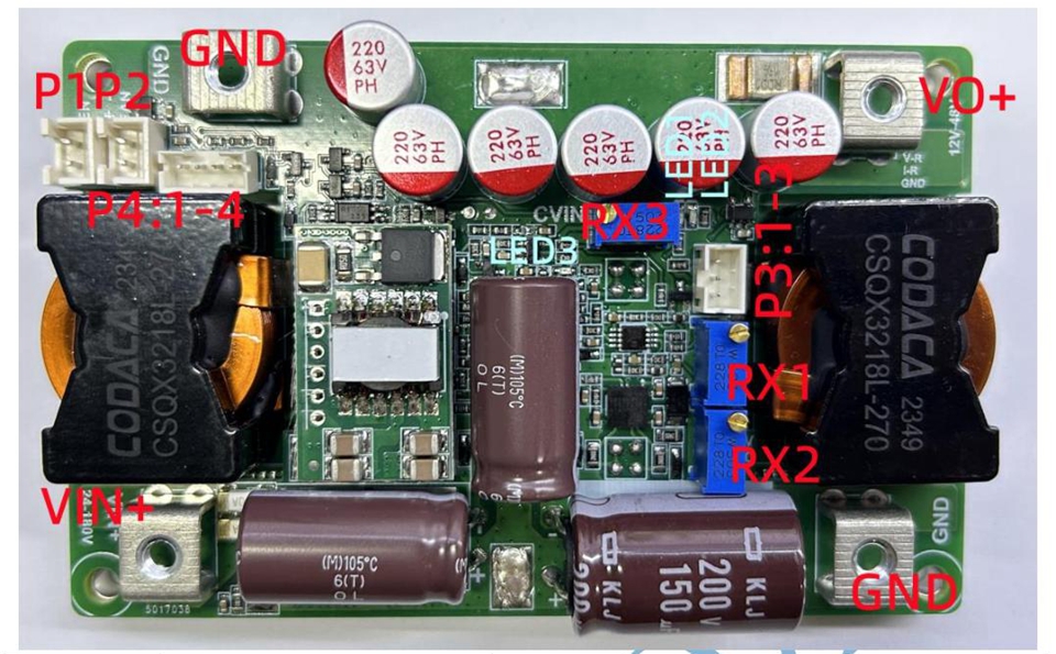 - LED3: input tracking indicator CVIN; If the actual input voltage is lower than the set input voltage, the light will turn on. For example, if the set voltage is 72V and the current actual input voltage is ≤72V, the light will turn on.