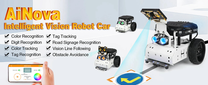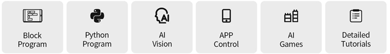 AiNova supports APP remote control for Android and iOS smart phones. With the provided APP, user can lean how to assemble and start AI vision games, which consists of assembly, operation and programming.