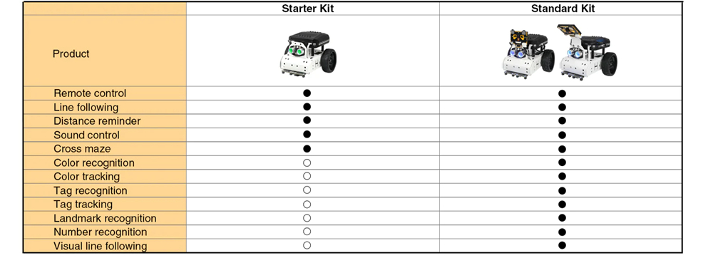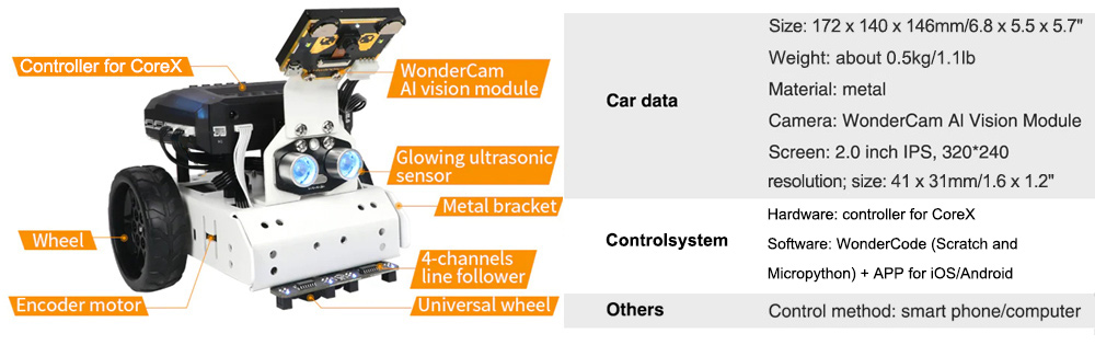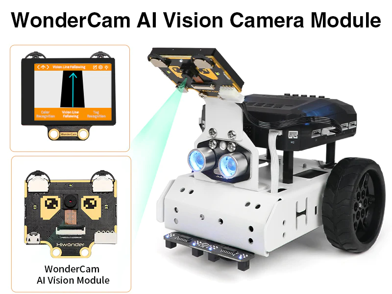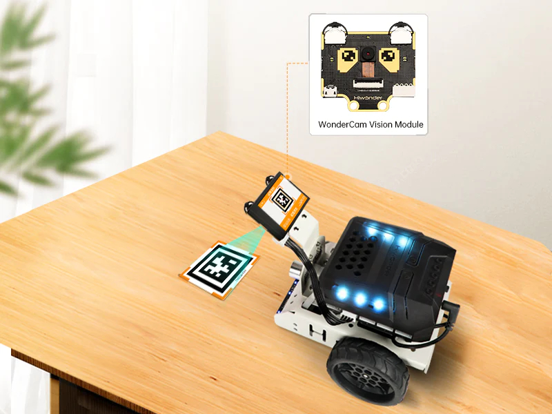 The standard version integrated with WonderCam vision module is available for AI games such as Autonomous Driving, Vision Line Follow, Tag Tracking, etc.