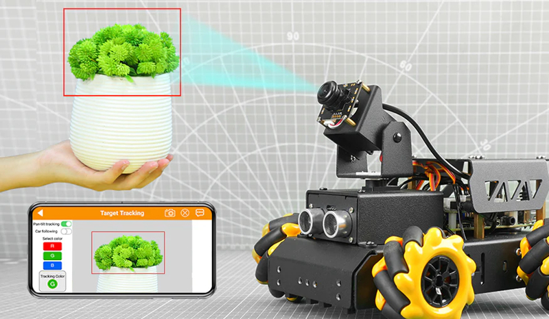 TurboPi tracks the target within its view. It supports two tracking modes. You can make pan tilt or pan tilt together with car body move with the target.