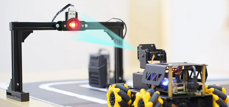 It combines 4-channel line follower and camera to achieve autonomous driving. Line follower is responsible for line following function, and camera is used to recognize traffic light and road signs.