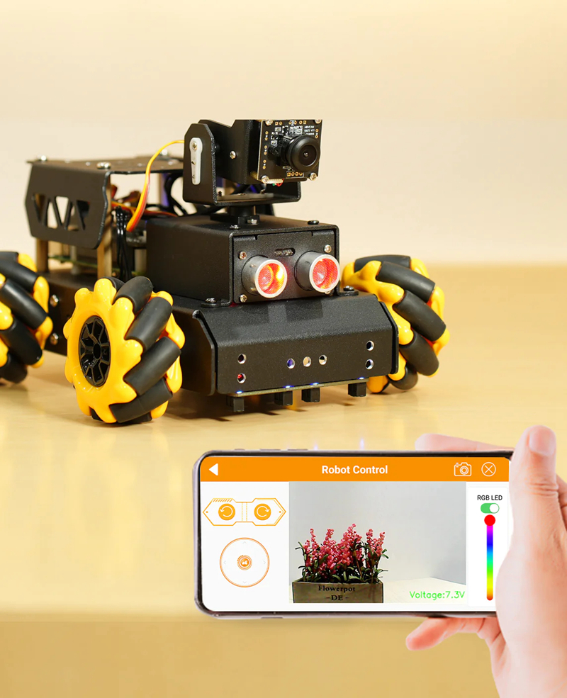 Equipped with RGB glowy ultrasonic sensor whose light can be adjusted, TurboPi is able to avoid obstacle smartly. In addition, it also supports variety of sensors to turn your creative AI ideas into reality. Abundant tutorials and Python source codes are provided to help you advance quickly into robot technology, machine vision and artificial intelligence!