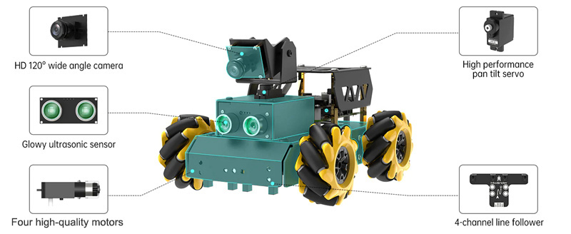 Loaded with 120° wide-angle camera, TurboPi can look around 180°, and up and down 180°. Combined with mecanum chassis car, its visual range is up to 360°.