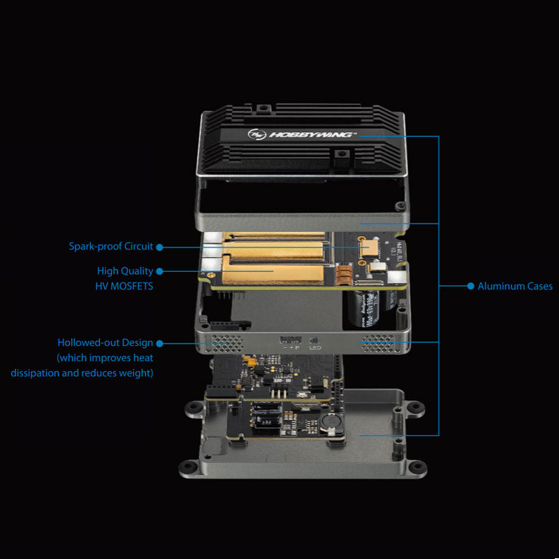 The built-in spark-proof circuit effectively eliminates the sparks produced when the ESC is powered on and extends the service life of connectors.