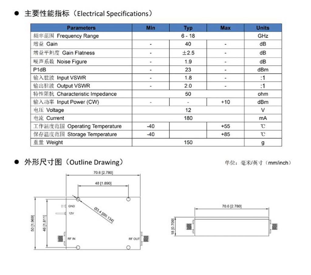 HXLNA-6-18-G40P23S 6-18GHz 40dB High Gain Low Noise Amplifier RF LNA with SMA Female Connector
