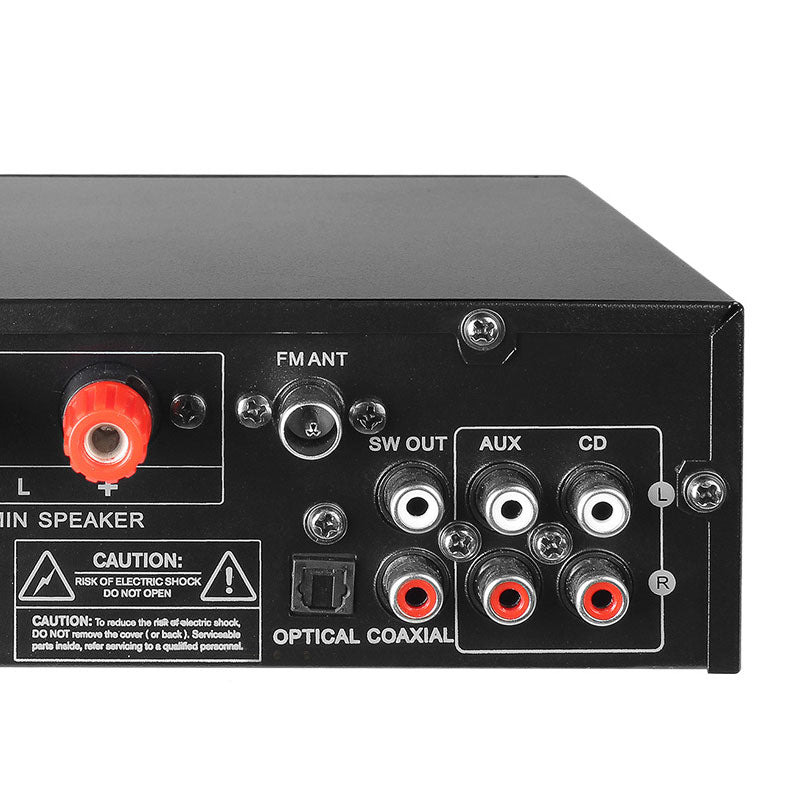 - Input ports: CD/AUX/FM, Bluetooth (built-in Bluetooth antenna), USB, optical/coaxial input