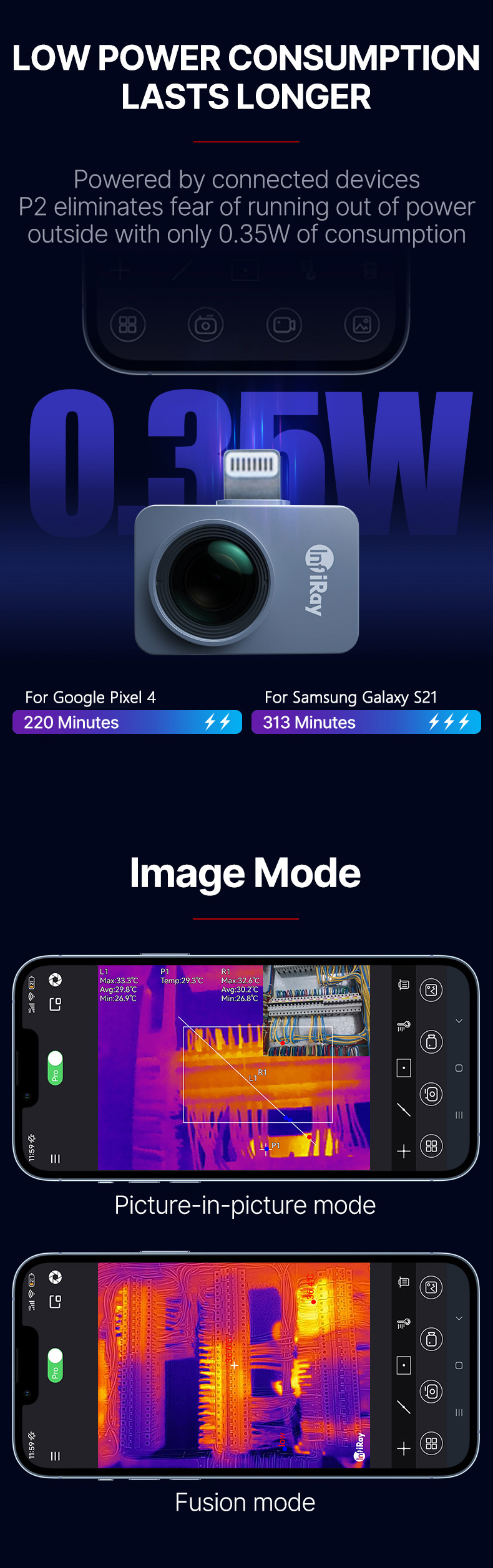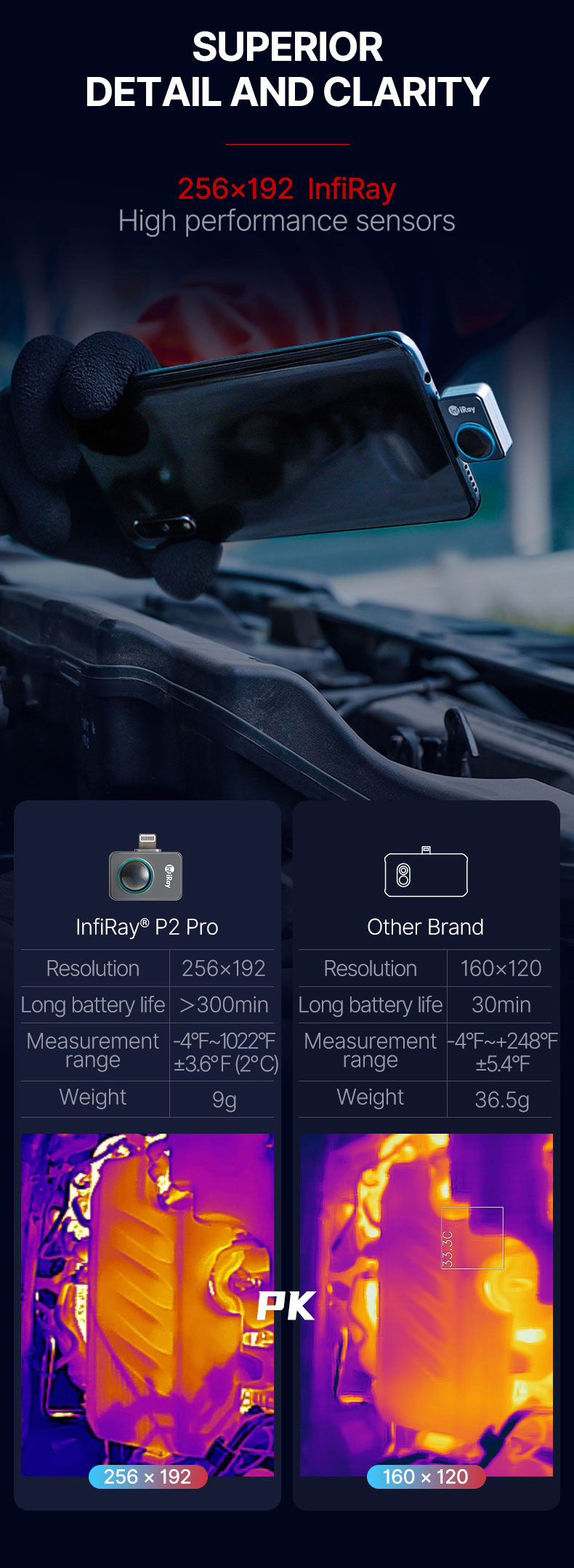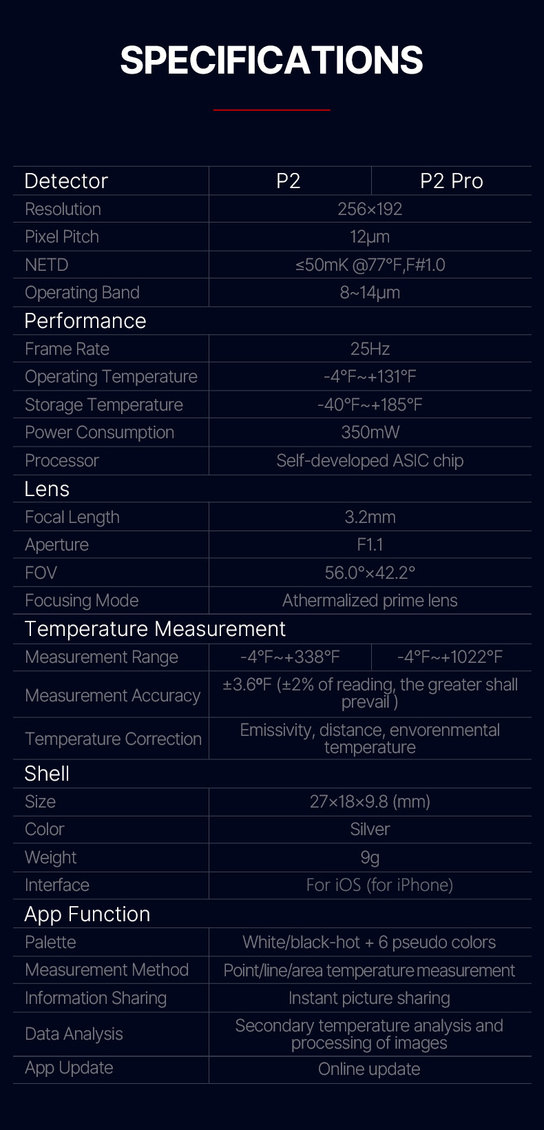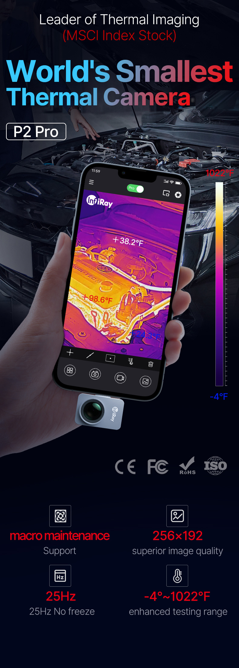 - Superior Performance: With 256x192 IR resolution/49,152 pixels and fast 25Hz frame rates, the P2 Pro thermography imager provides high-definition image with full-screen temperature measurement (Max, Min and Center Spots), and a wide temperature range from -4°F to 1022°F (-20°C to 550°C).