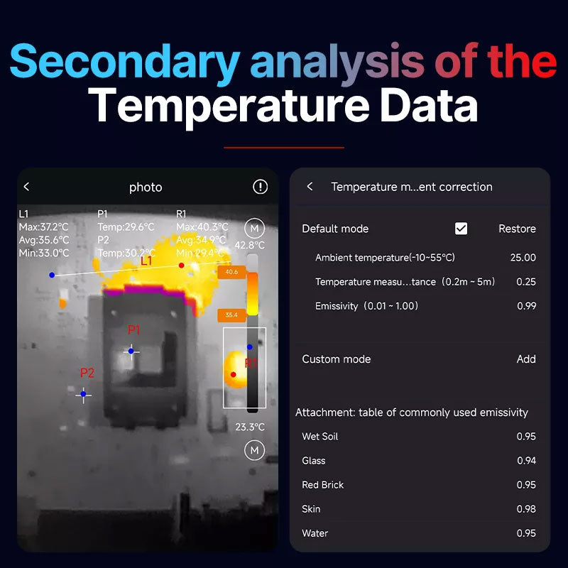 - Battery-free & Secondary Analysis: This thermal camera is easily to use with smartphones and no need extra battery. The infrared images have been taken can be used for secondary analysis, it can be opened directly with the software, perform point-line-surface analysis, no need to insert product.