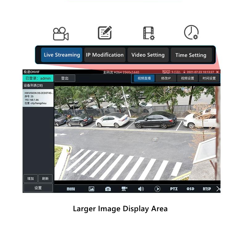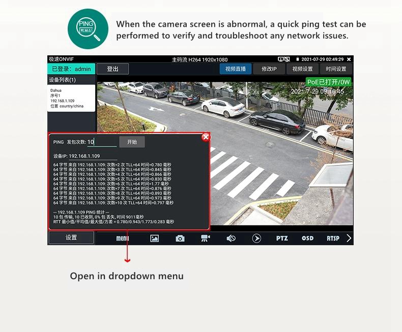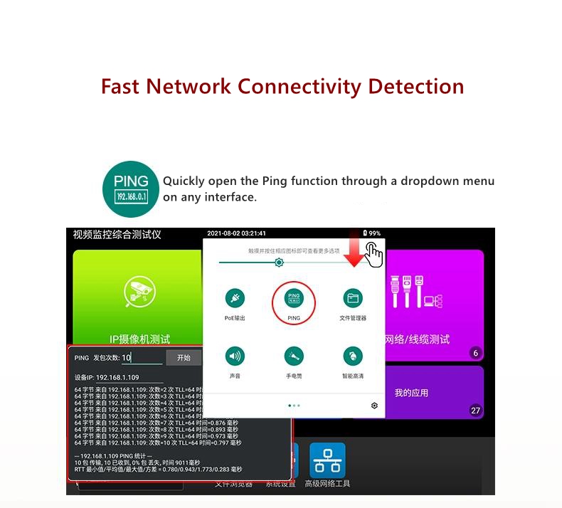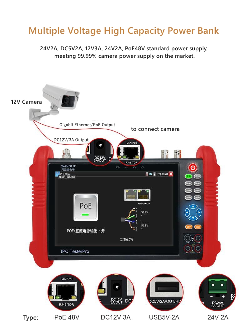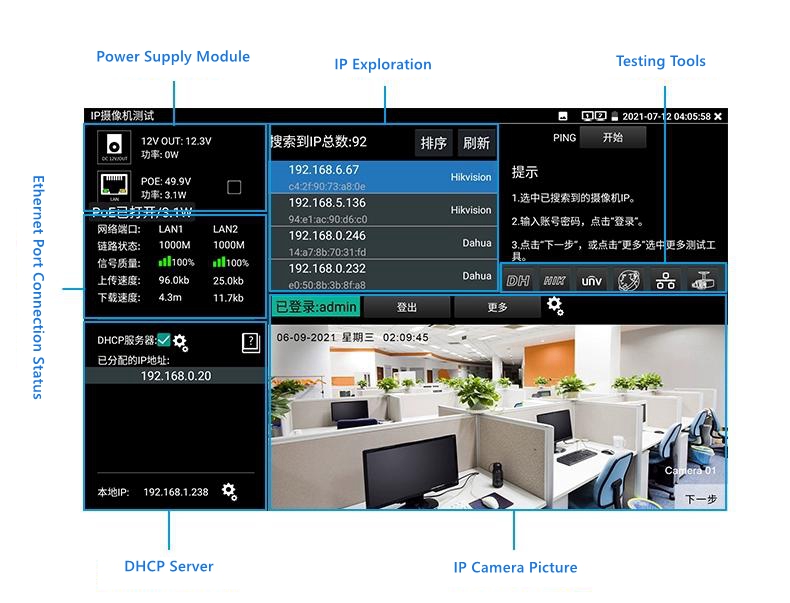 - [New Function] smart IPC: integrated with power supply for network camera testing, IP exploration, image viewing, activation, link status, and other steps. Implement one click testing for network cameras.