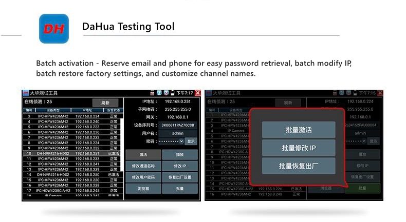 - For Dahua Hikvision Huawei testing tool: batch activation and IP modification for Hikvision Dahua cameras, custom modification of channel names, and the ability to modify parameters such as usernames and passwords.