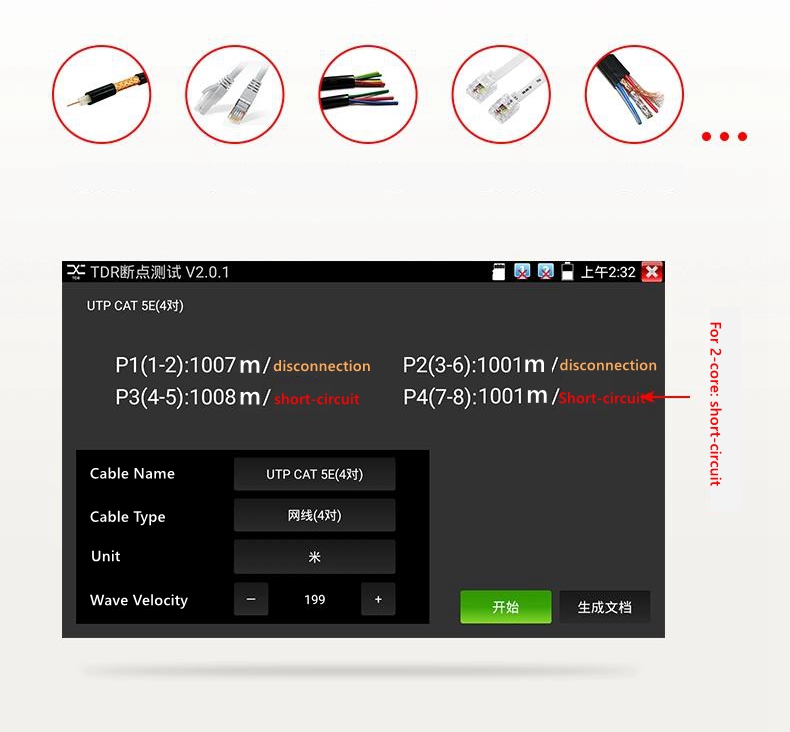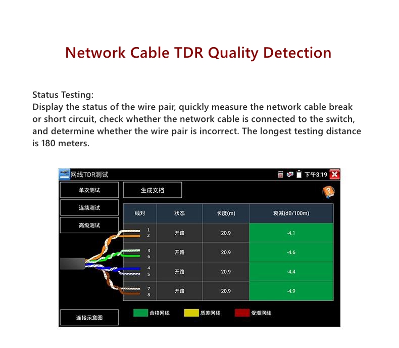 - Using true TDR pulse reflection technology, unaffected by the environment, the cable short circuit and breakpoint position length can be accurately tested up to 1.2km. Direct display of multiple cable pairs provides a more intuitive display of the entire cable condition, making it easy to troubleshoot.