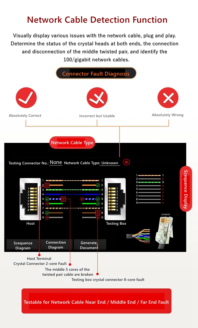 - UTP Ethernet cable testing: It can test the sorting and numbering of Ethernet cables to determine the quality of crystal connectors.