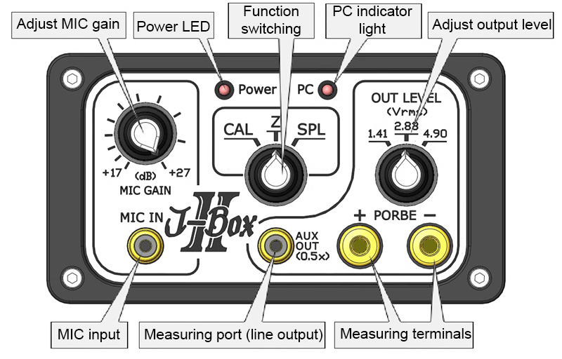 - J-BOX's built-in amplifier provides 1.41, 2.83 and 4.90Vrms (15W) level output. The original sampling level automatic balancing circuit can change the output at any time during measurement without having to set the volume console on the computer again.