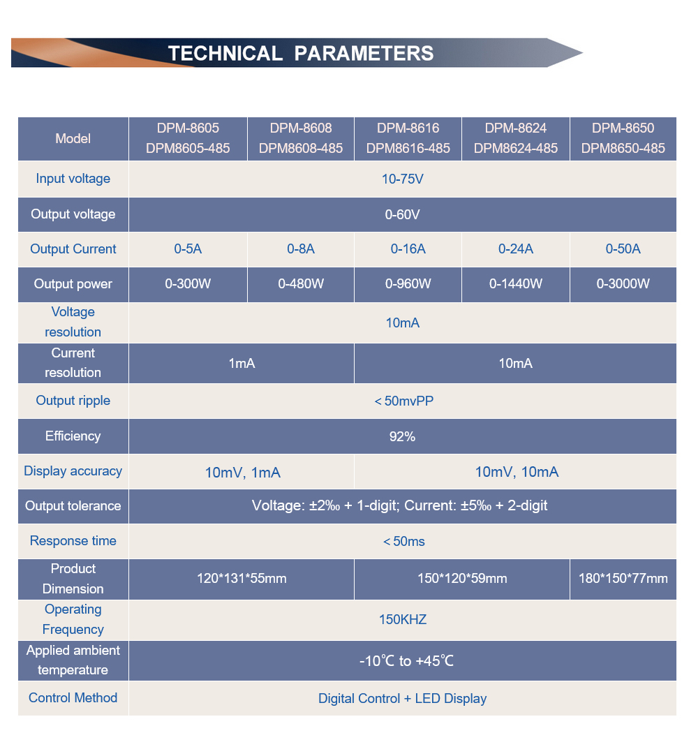 DPM8600 series programmable DC power supply can digitally display the output voltage, current, temperature and other parameters. They have two different output status of constant voltage and constant current. They are especially suitable for use in factory equipment power supply, product aging and debugging, solar charging, LED lamp bead driving and battery charging and discharging.