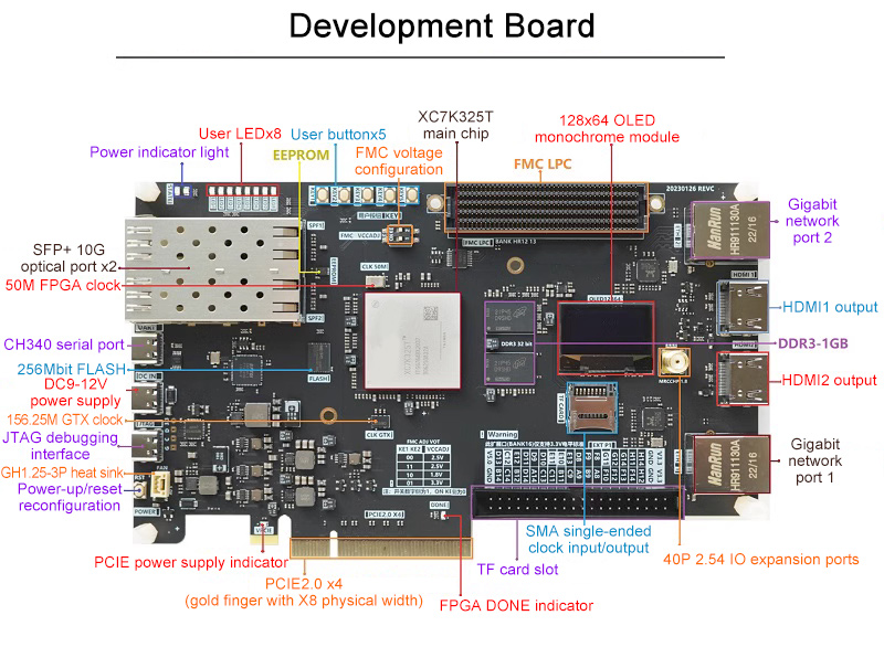 - IO expansion port: FMC LPC and 40P standard 2.54 double-row expansion port; FMC includes LA (34 pairs differential + 2 pairs of clock differential) and 1 pair of GTX; The 40PIN 2.54 IO expansion ports contains only 34pcs 3.3V single-ended IO