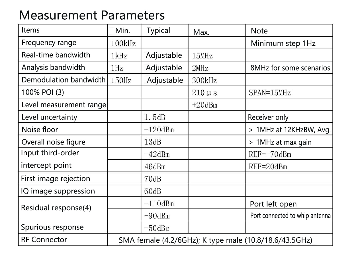 What's more, this speed is still far below the theoretical upper limit, and the main reason is that both tuning and data processing would take time. As a matter of fact, a measurement with FFT at 5kHz precision would take only 0.1ms, no matter how large the frequency range is, theoretically. Practically speaking, the speed can approach this theoretical limit within the real-time bandwidth. Being limited by its hand-held tier volume and power, the real-time bandwidth is not that wide, so KC908 needs splicing if the tested frequency range is wider than the real-time bandwidth. Thus, it takes time for locking and tuning, which are much slower than FFT.
