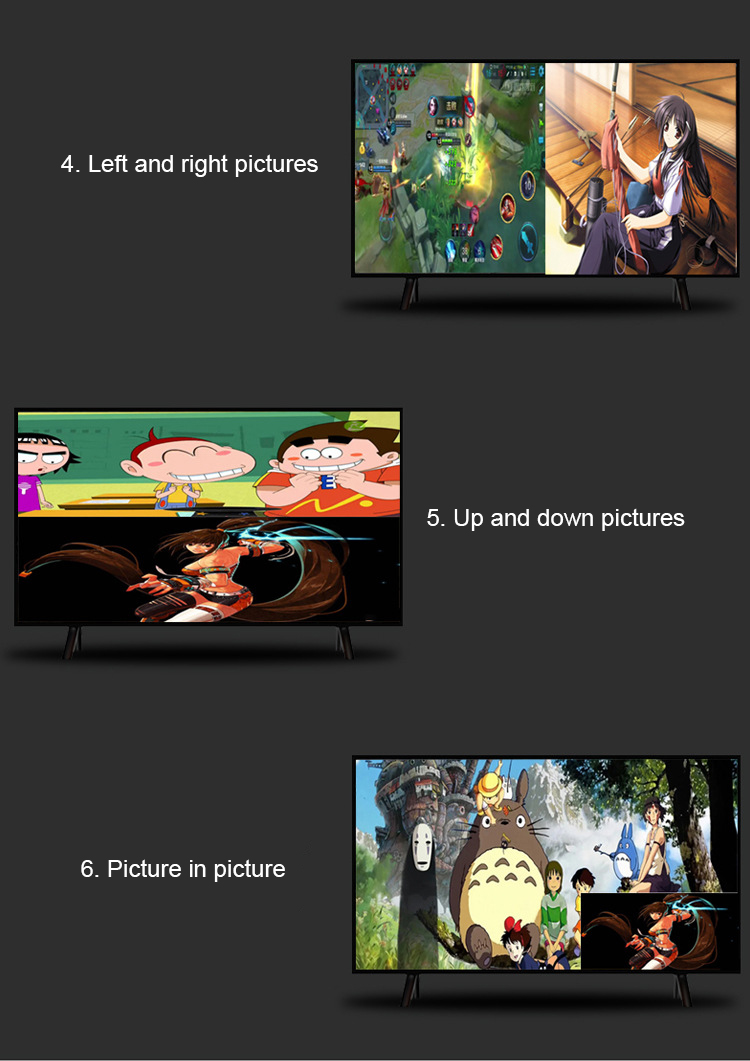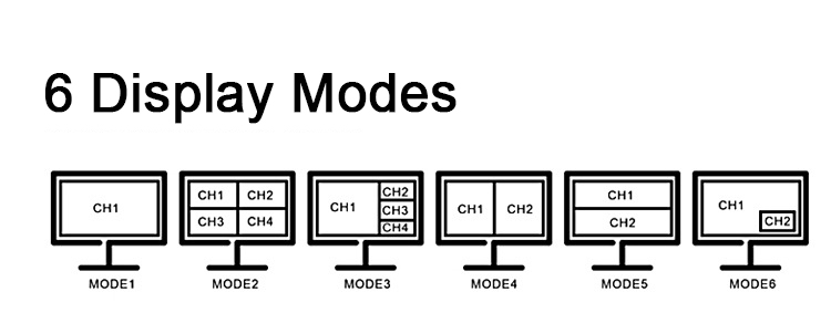 - MODE 6: Picture in picture. Use Down button to choose CH1/CH2 or CH3/CH4 combination, and use Up button to switch the pictures' position