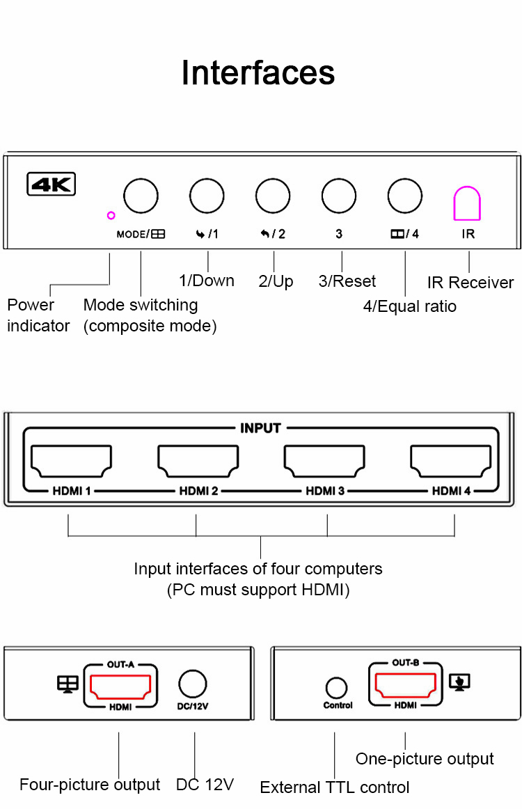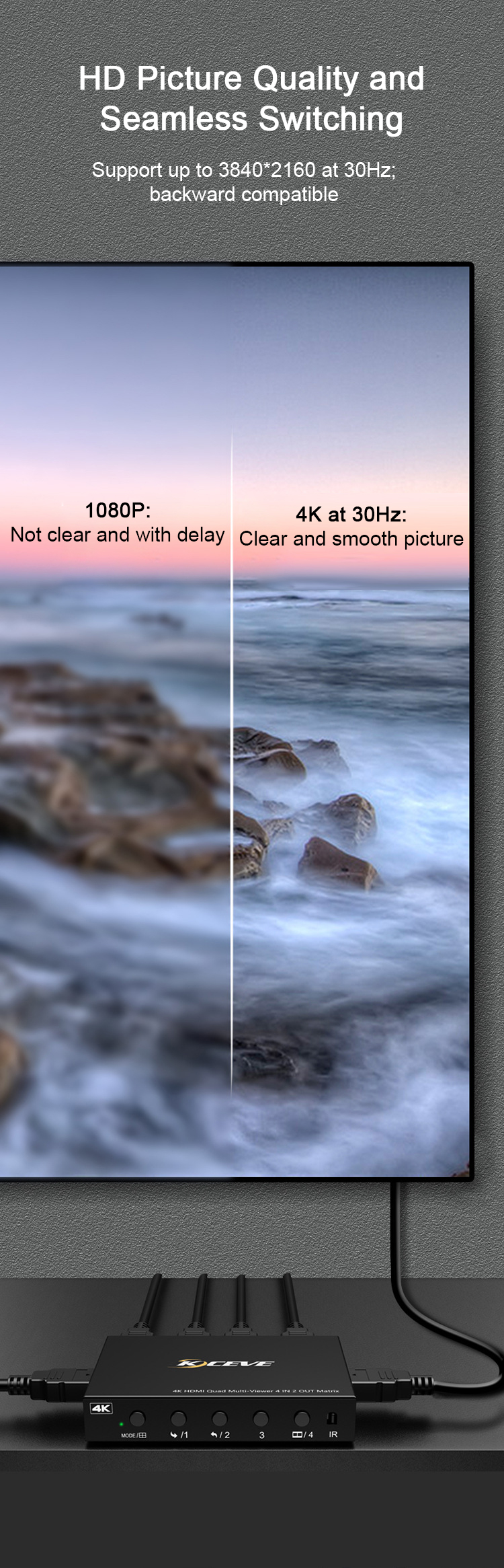 - HD picture quality and seamless switching. Support up to 3840*2160 at 30Hz; backward compatible