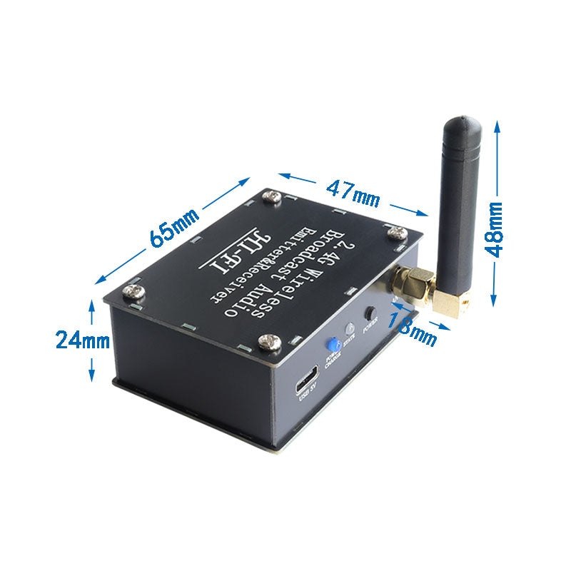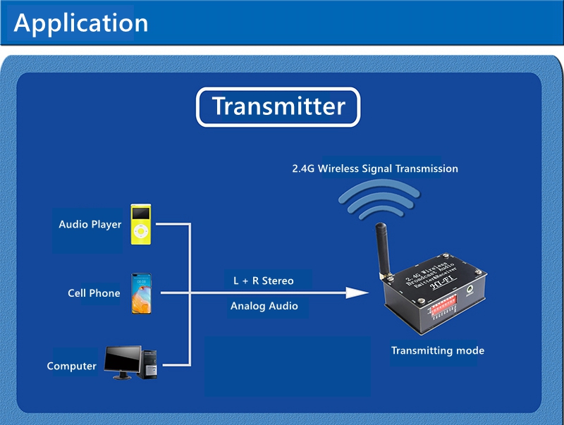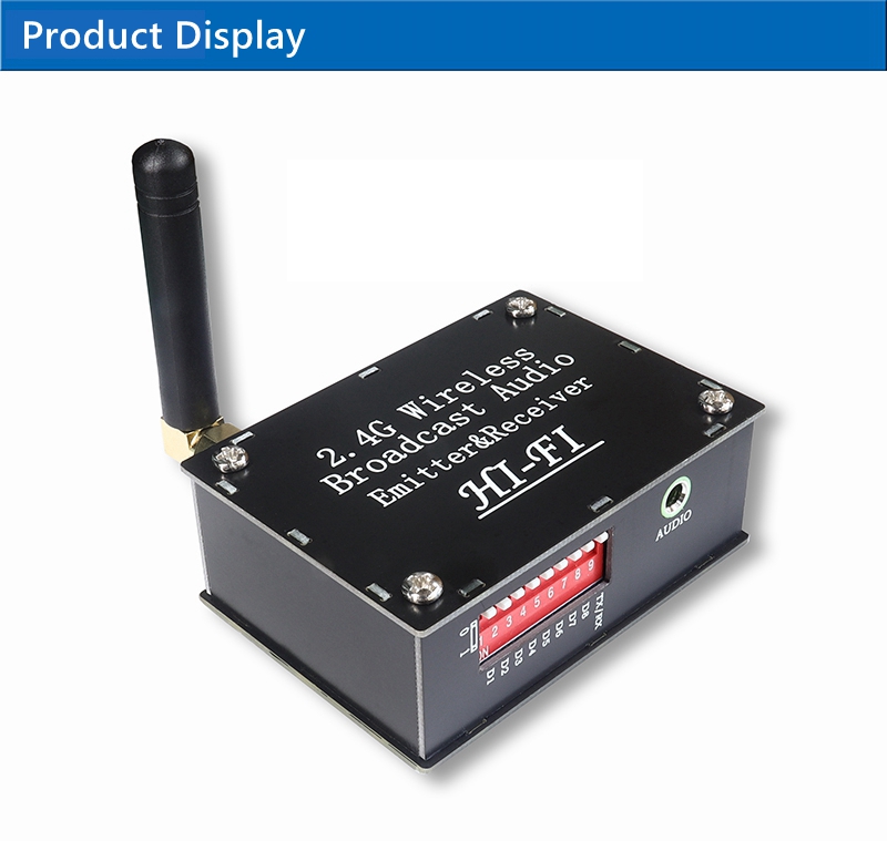 The stereo audio signal input from the 3.5mm stereo audio port at the transmitter end is first sampled and encoded by 24Bit stereo audio ADC at a 48KHz sampling rate, and then transmitted to space in the form of digital signal through the ISM band radio signal with a carrier of 2.402-2.480GHz.