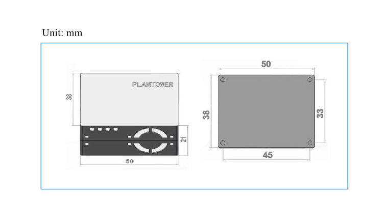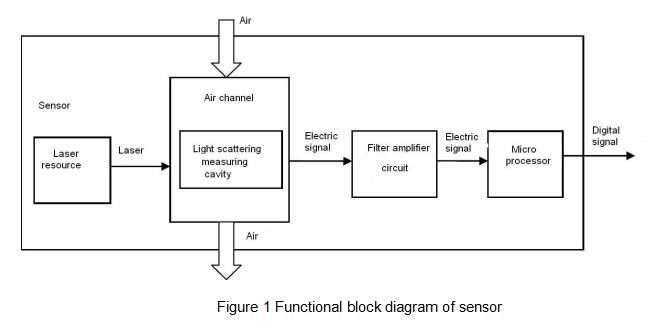 This sensor uses the principle of laser scattering. The laser is irradiated on the suspended particles in the air to produce scattering, and at the same time, the scattered light is collected at a certain angle to obtain the curve of the scattered light intensity with time. Furthermore, the microprocessor uses an algorithm based on the MIE theory to obtain the equivalent particle size of the particles and the number of particles of different sizes per unit volume.