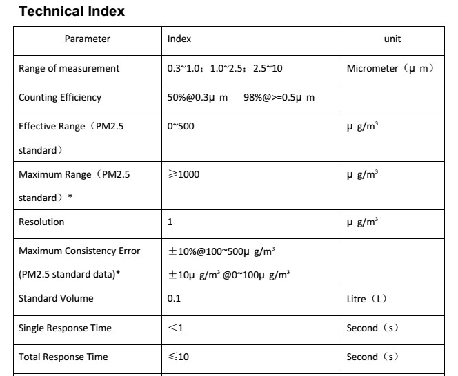 1. The main output is mass concentration and concentration number of particles in a unit volume. The unit volume of the number of particles is 0.1 liter, and the unit of mass concentration is: microgram/cubic meter.